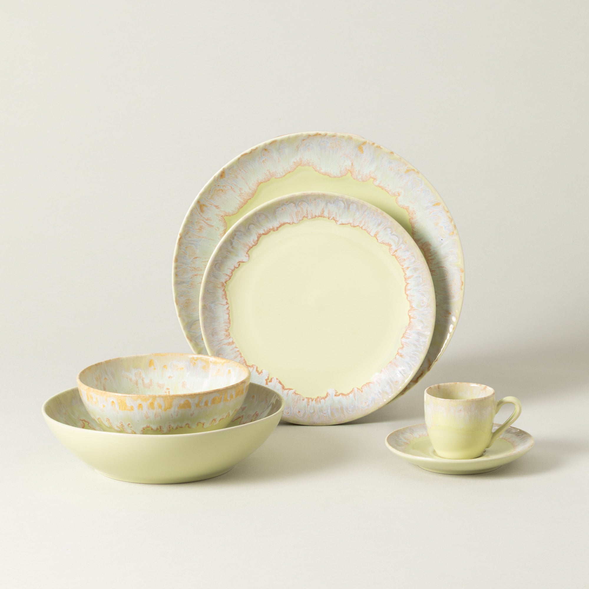 The Taormina collection is inspired by contemporary aesthetics, offering a modern approach to everyday dining. Made of fine stoneware, it stands out for its shiny glaze with a reactive finish, resulting in unique combinations of colors and effects in each piece.