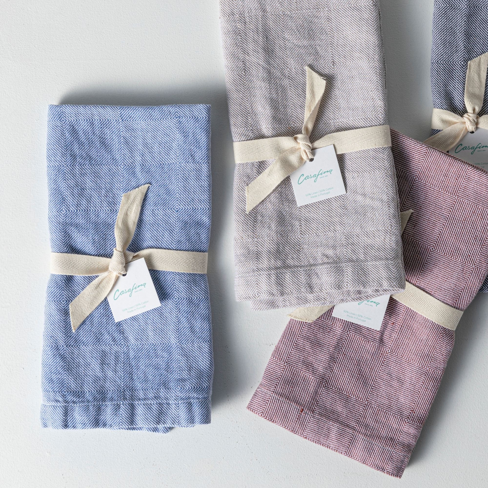 Made in Portugal, the Emilia napkin collection blends linen and cotton, combining linen's durability with cotton's softness and absorbency. This blend offers excellent resilience, absorbs spills effectively, and provides a balanced tactile experience. Available in 4 soft colors, they add a subtle hint of color to the table. 50% linen, 50% cotton.
