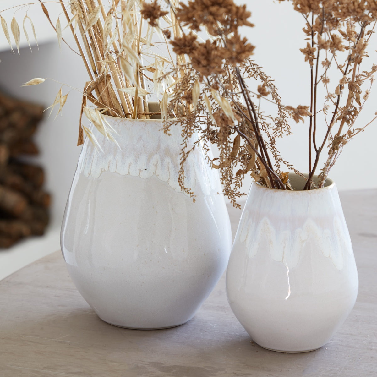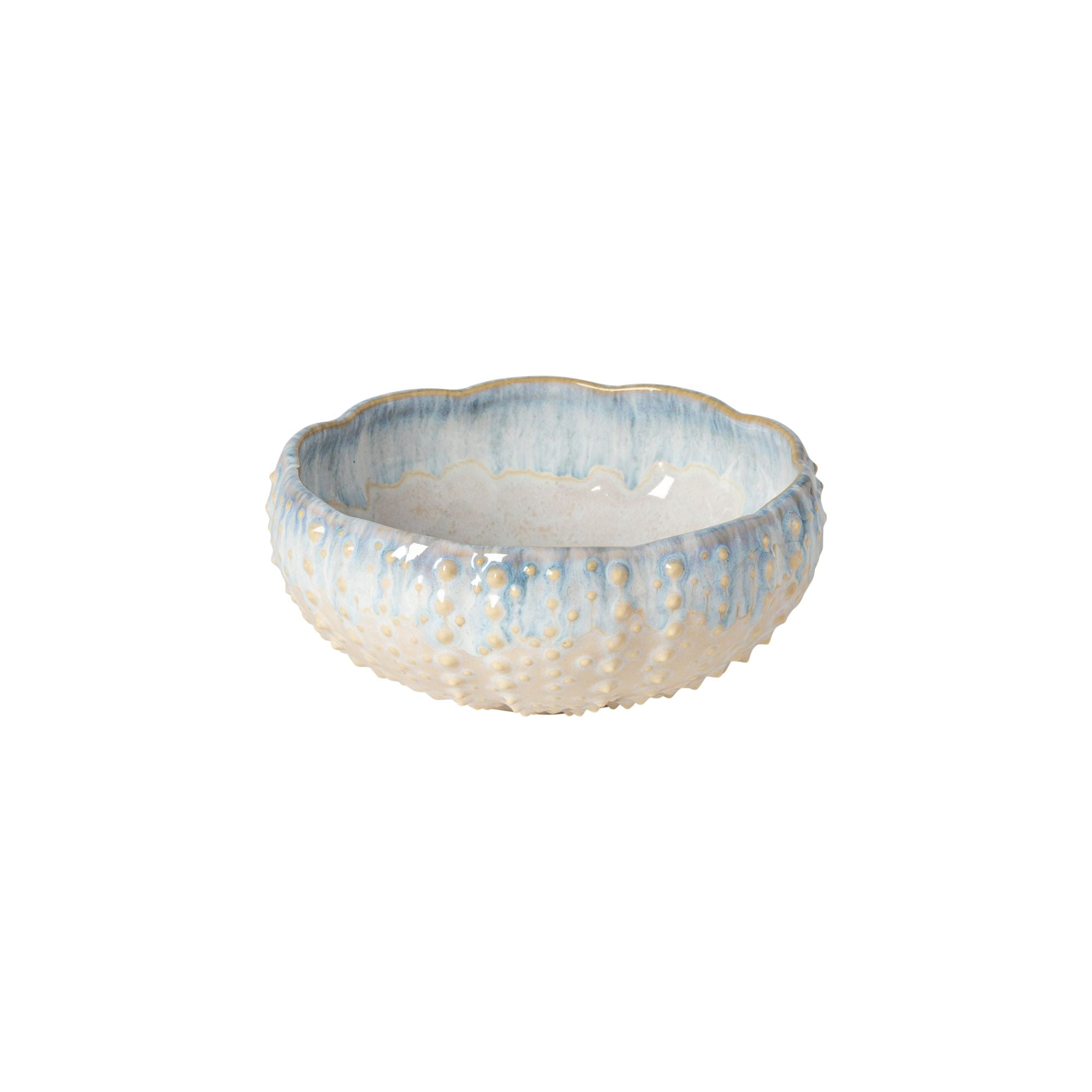 Featuring organic shapes and a reactive glaze in shades of white and blue, it flows naturally down the sides, creating a one-of-a-kind finish on each piece.