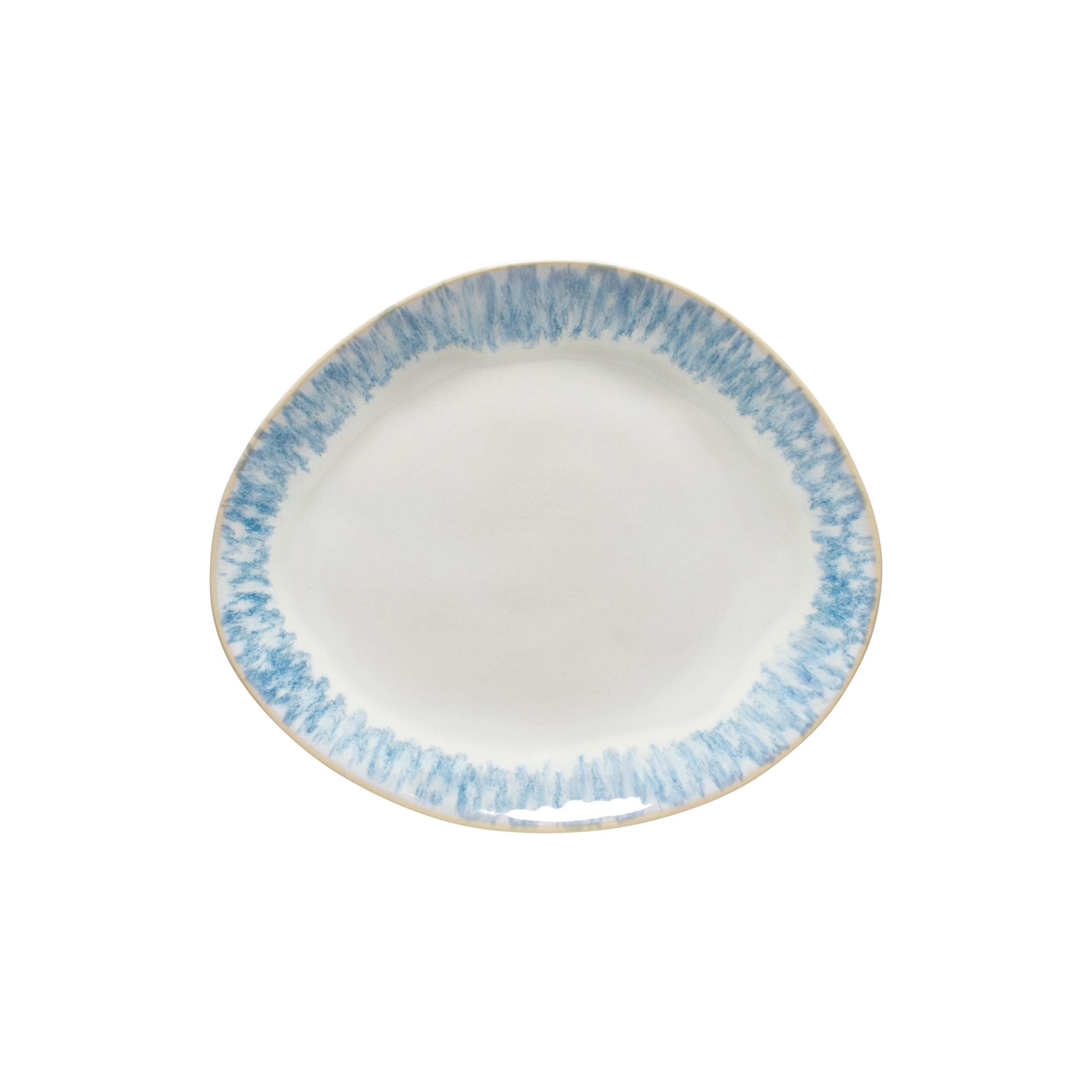 The Brisa Pasta / Serving Bowl, handcrafted in Portugal from fine stoneware, features organic shapes inspired by the Algarve Coast. Its reactive glaze in white and blue creates a unique finish, ensuring that no two pieces are alike.